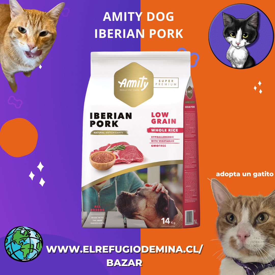 Amity Low Grain Iberian Pork Adult es un alimento para perros adultos de todas las razas y tamaños formulado con cerdo ibérico, arroz integral y verduras. Alimento hipoalergénico y Libre de GMO.